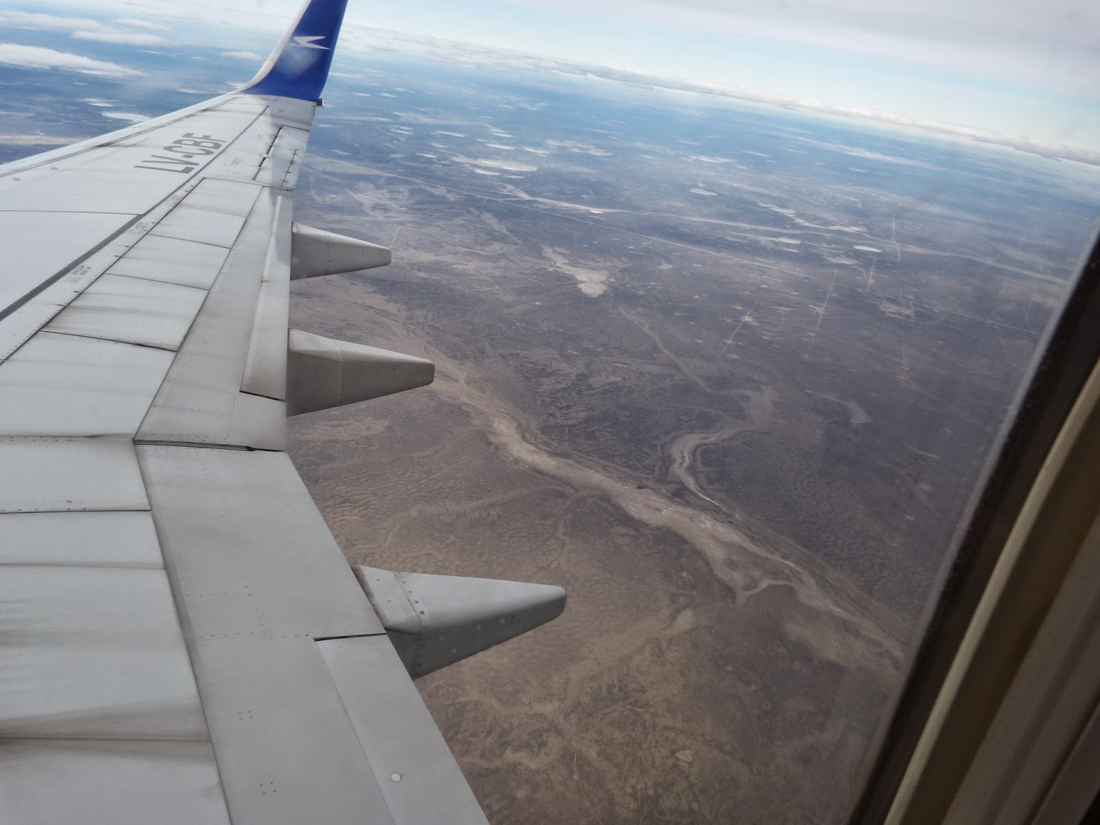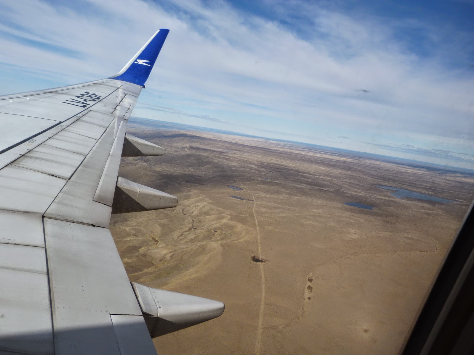 En tout cas, les paysages vus du ciel étaient spectaculaires, et ont rapidement changé dès qu’on a atteint la Patagonie et ses immenses étendues de steppe désertique (et non pas de « pampa », expression employée à tort car la pampa c’est verdoyant en réalité) .