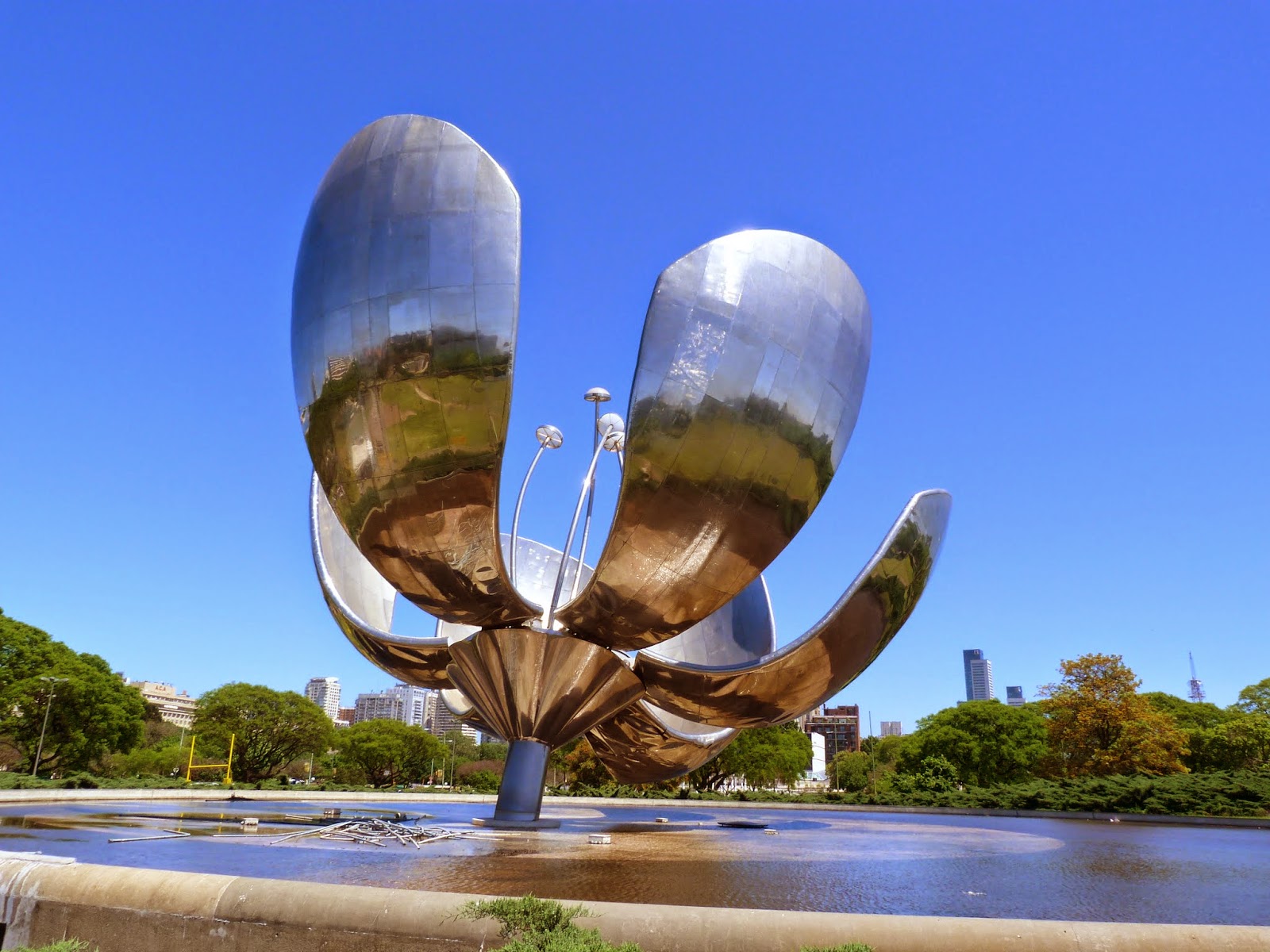 Impressionnante sculpture de 25m de haut, en acier et aluminium, représentant une fleur géante à 6 pétales et 4 pistils.