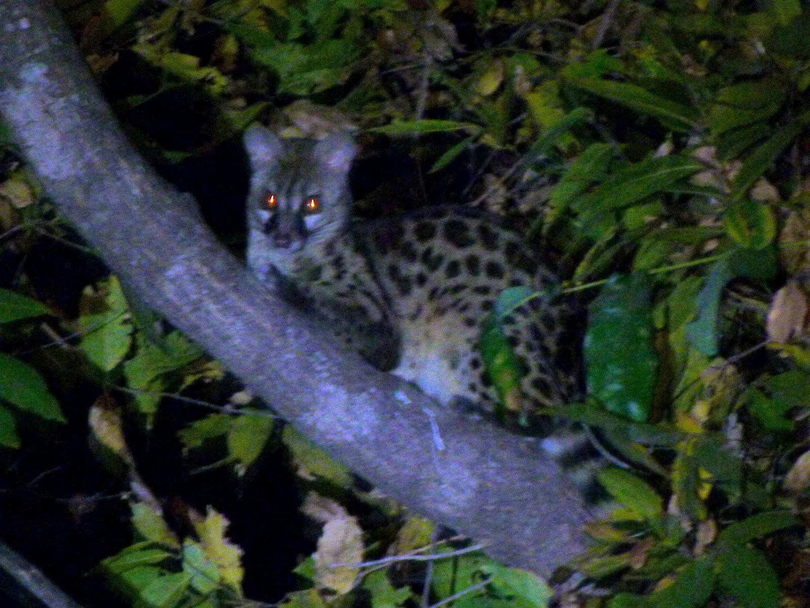 En braquant une lampe vers ce que nous montre le garde, la magie opère instantanément : une magnifique genette nous observe tranquillement, allongée sur une grosse branche. Elle est de belle taille. Son pelage est très beau. Ses yeux rouges reflètent la lumière de nos frontales, c’est impressionnant dans cette nuit noire, mais nous sommes émerveillés.