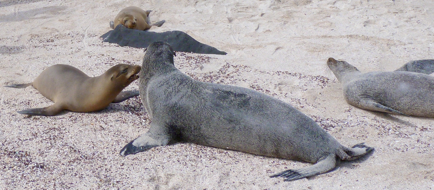 Seymour Norte est une île basse et sans relief où le débarquement se fait à sec, en prenant soin toutefois d’enjamber les lions de mer (=otaries) qui monopolisent le chemin d’accès et peuplent toute l’île, et en évitant d’écraser les crabes rouges écarlates qui pullulent absolument partout !