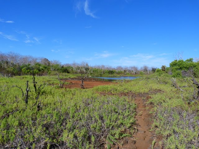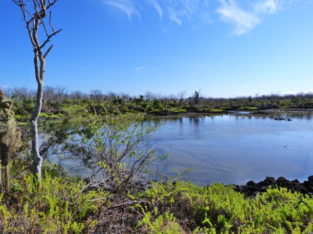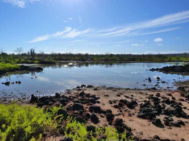 Depuis la plage de l’embarcadère, un sentier traversant une « forêt » aride de grands cactus, d’arbres odorants Palo Santo et de diverses plantes grasses, rejoint des lagunes dont la particularité est l’extrême salinité de leur eau, bien plus salée que l’océan.