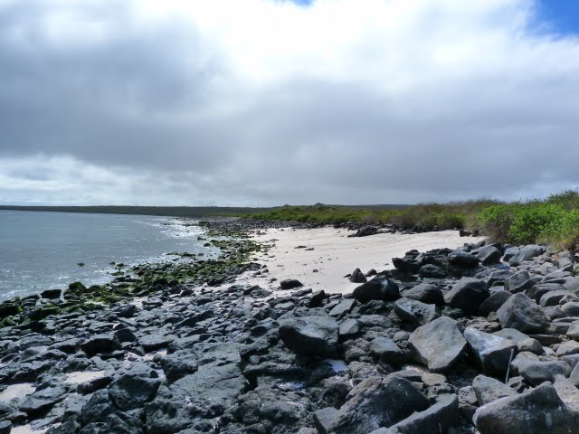 Le sentier continue après cette lagune (sans flamant ce jour-là donc…) et rejoint une autre plage de l’autre côté de la Pointe Cormoran. Celle-ci est très différente : plus sauvage, battue par les vagues, faite de sable de coraux blancs. Des tortues de mer vertes viennent y pondre. On peut observer également des raies, des crabes rouges, des grands hérons bleus, des hérons des Galápagos, des Parulines, des lézards des laves, de nombreux oiseaux migrateurs du littoral.