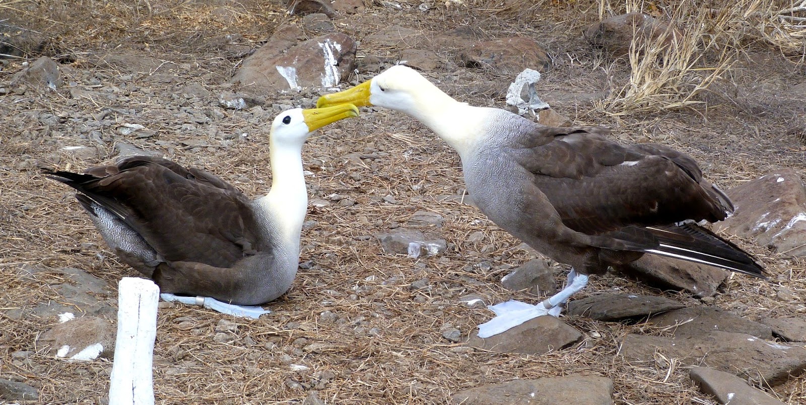 Les albatros sont monogames et chaque couple formé, c’est pour la vie ! La parade amoureuse vaut vraiment le détour. Les amoureux marchent l’un vers l’autre en se dandinant, levant les pattes et balançant exagérément leur tête d’un côté et de l’autre. Les retrouvailles faites, le ballet nuptial peut commencer. Les becs se touchent, se cognent bruyamment, font des cercles l’un autour de l’autre, on dirait qu’ils s’embrassent. Ils se caressent le plumage en poussant des cris sonores. Toujours face à face, les becs claquent sèchement dans l’air. Les caquètements se font de plus en plus intenses et rythment la chorégraphie qui se déroule sous nos yeux ébahis. L’un des deux (la femelle je suppose) finit par se poser au sol cou et tête tendus vers son partenaire qui crie de plus belle, comme s’il hurle son désir ardant ! La parade se répète inlassablement et dure plusieurs jours avant le passage à l’acte.