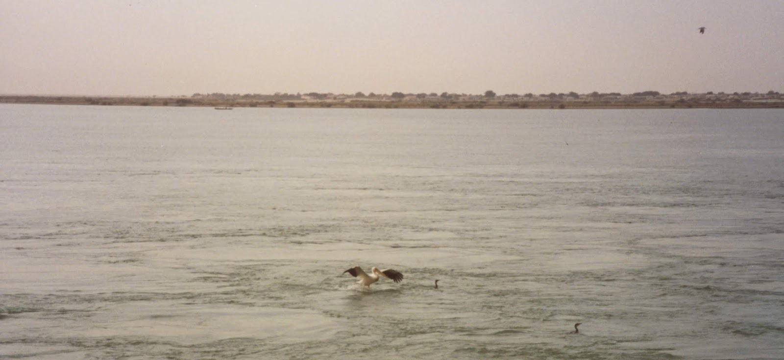 On est partis de Saint-Louis au petit matin, à la fraîche, en longeant le fleuve Sénégal direction le grand barrage de Diama, situé avant le Parc National du Djoudj (l’un des plus grands parc ornithologique du monde). C’est là que l’on a traversé le fleuve-frontière. Je n’ai pas trop compris les formalités… Le patron de l’hôtel est allé longuement parlementé avec les agents (armés de mitraillettes) en poste là et finalement on est passés comme ça !?!?