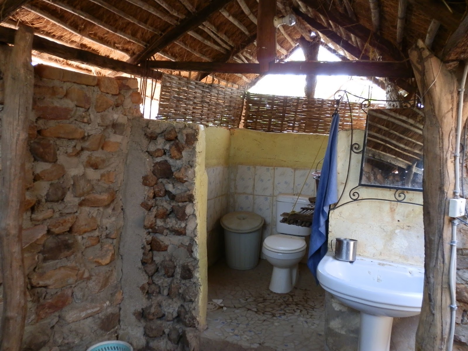 La manœuvre va donc consister à me laver en extérieur, mais (à peu près) à l’abri des regards indiscrets des locaux, curieux d’apercevoir une toubab à poil. Il y a du passage derrière le mur, on entend trafiquer et parler. Mais bon…. ils ne peuvent voir que le haut de ma tête dépasser, donc je m’en accommoderai. Et puis à ma grande surprise, je trouve que c’est plutôt agréable dehors sous cette paillote.